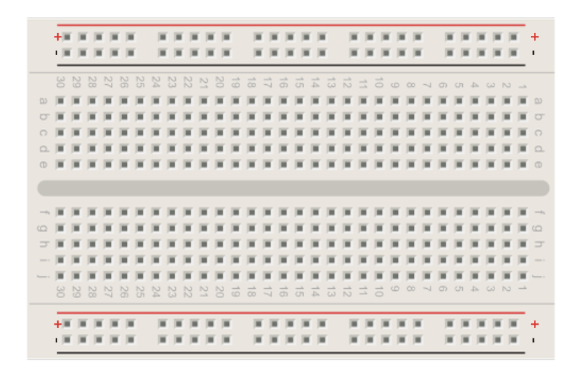 A board on which you can build electronic circuits. It’s like a patch panel, with rows of holes that allow you to connect wires and components together. Versions that re- quire soldering are available, as well as the sol- der-less type used here.