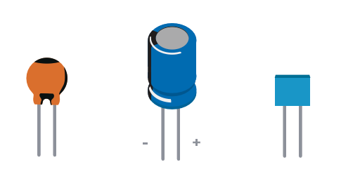 These components store and release electrical energy in a circuit. When the circuit's voltage is higher than what is stored in the capacitor, it allows current to flow in, giving the capacitor a charge. When the circuit's voltage is lower, the stored charge is released. Often placed across power and ground close to a sensor or motor to help smooth fluctuations in voltage.