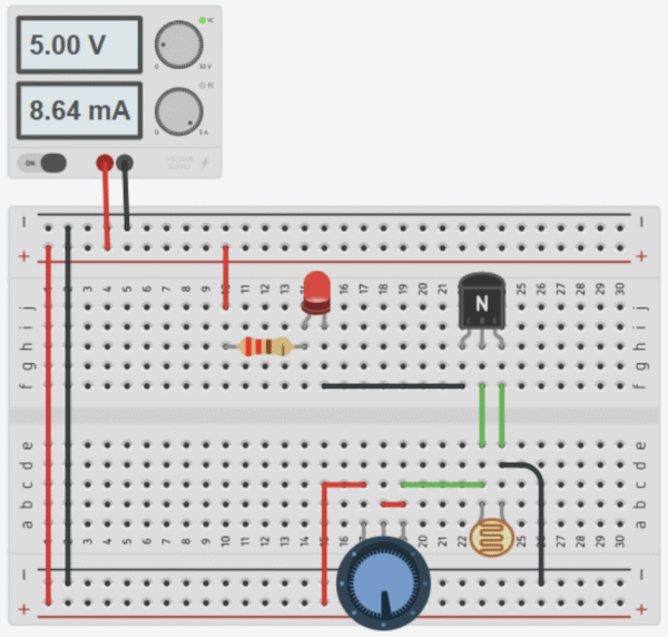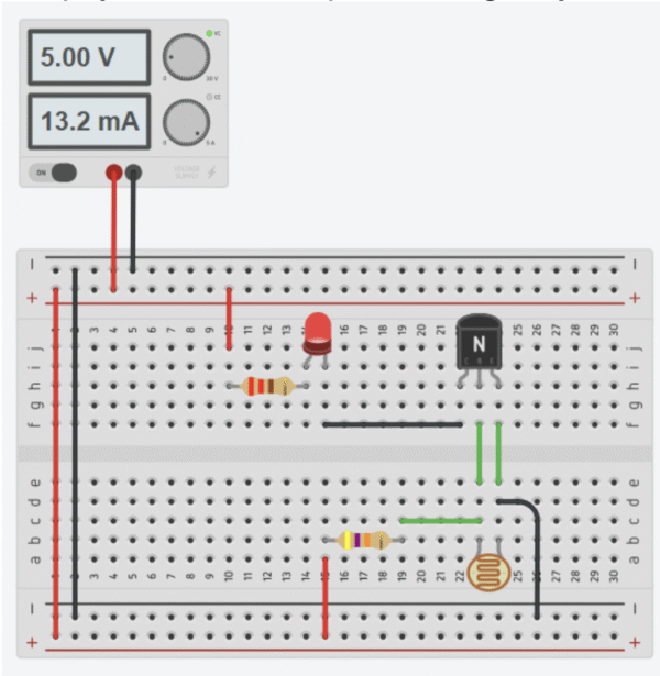 . Wave a hand over the LDR. Observe and call out what happens to LED brightness and supply current. - If the LED behavior is inverted, swap the positions of the LDR and the fixed resistor (put LDR to